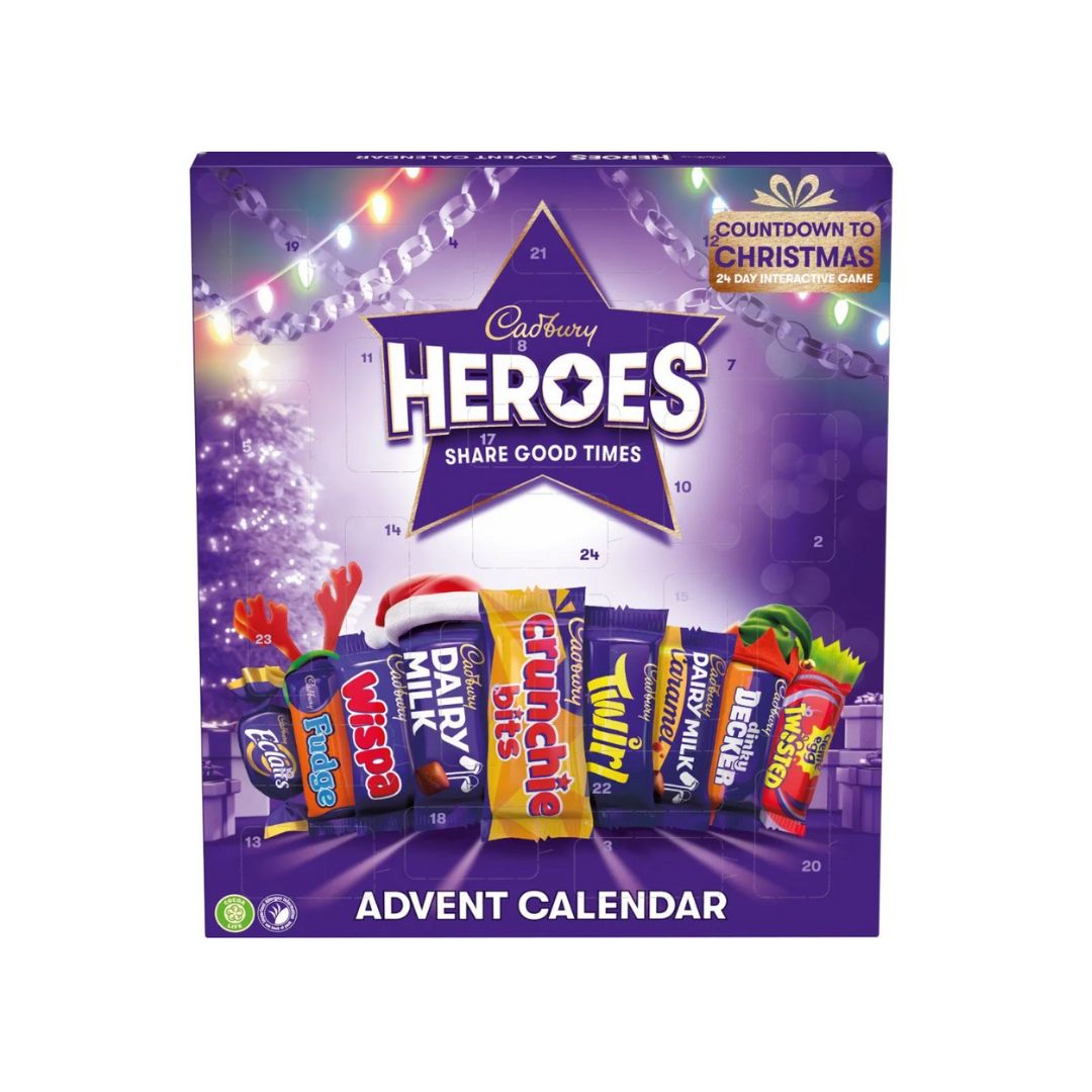 The Cadbury Heroes Christmas Advent-ure Calendar. Open a little door each day in your countdown to Christmas to find a Heroes chocolate - it may be Creme Egg Twisted, Wispa, Twirl, Dairy Milk Caramel, Dairy Milk, Fudge, Crunchie Bits, Dinky Decker or Cadbury chocolate Eclairs.