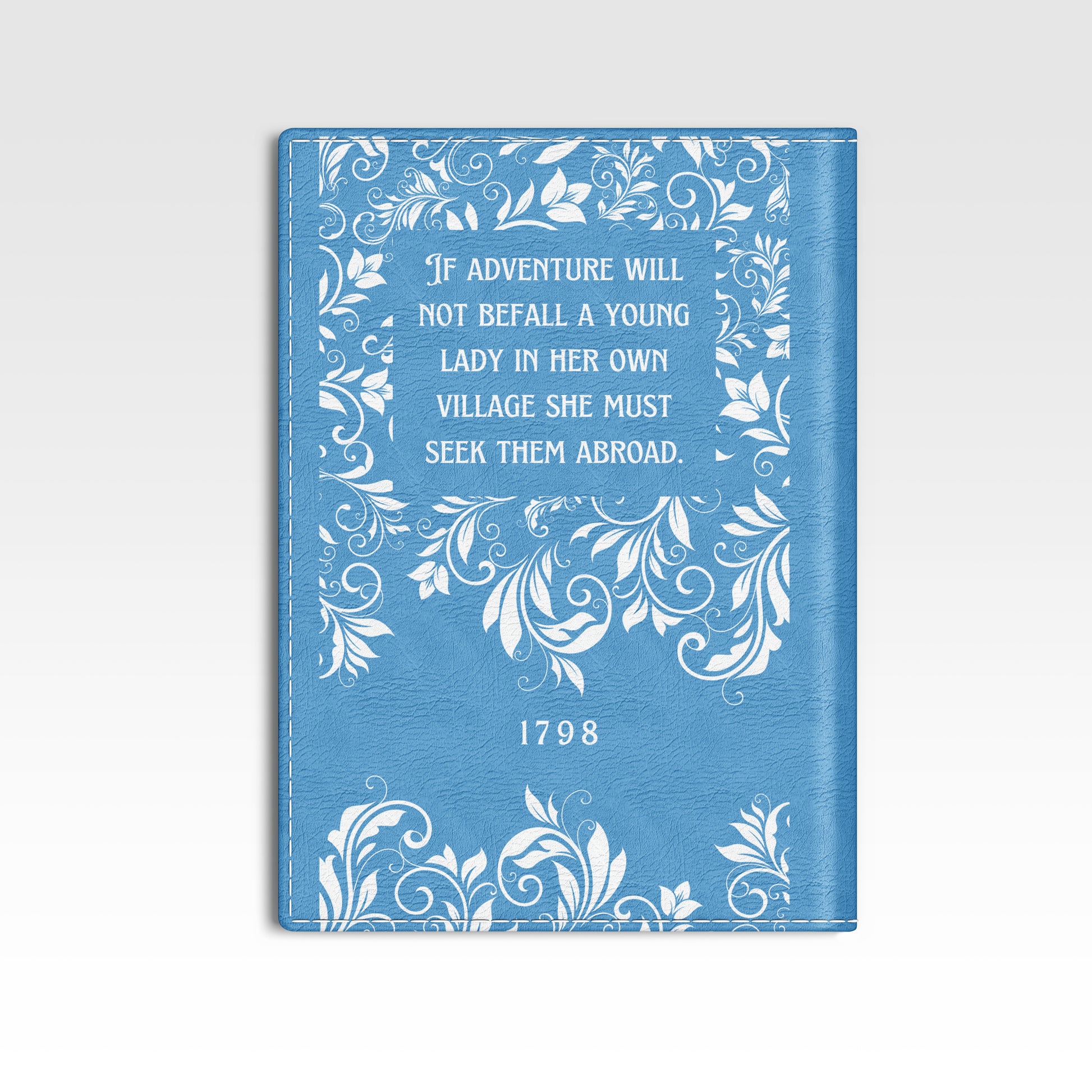 Travel in style with our elegant Northanger Abbey passport holder. Designed in house, the design replicates the look of a vintage hardback book and will fit nicely inside your bag when traveling. The back of the passport holder features the quote “If adventures will not befall a young lady in her own village, she must seek them abroad.” from the novel.