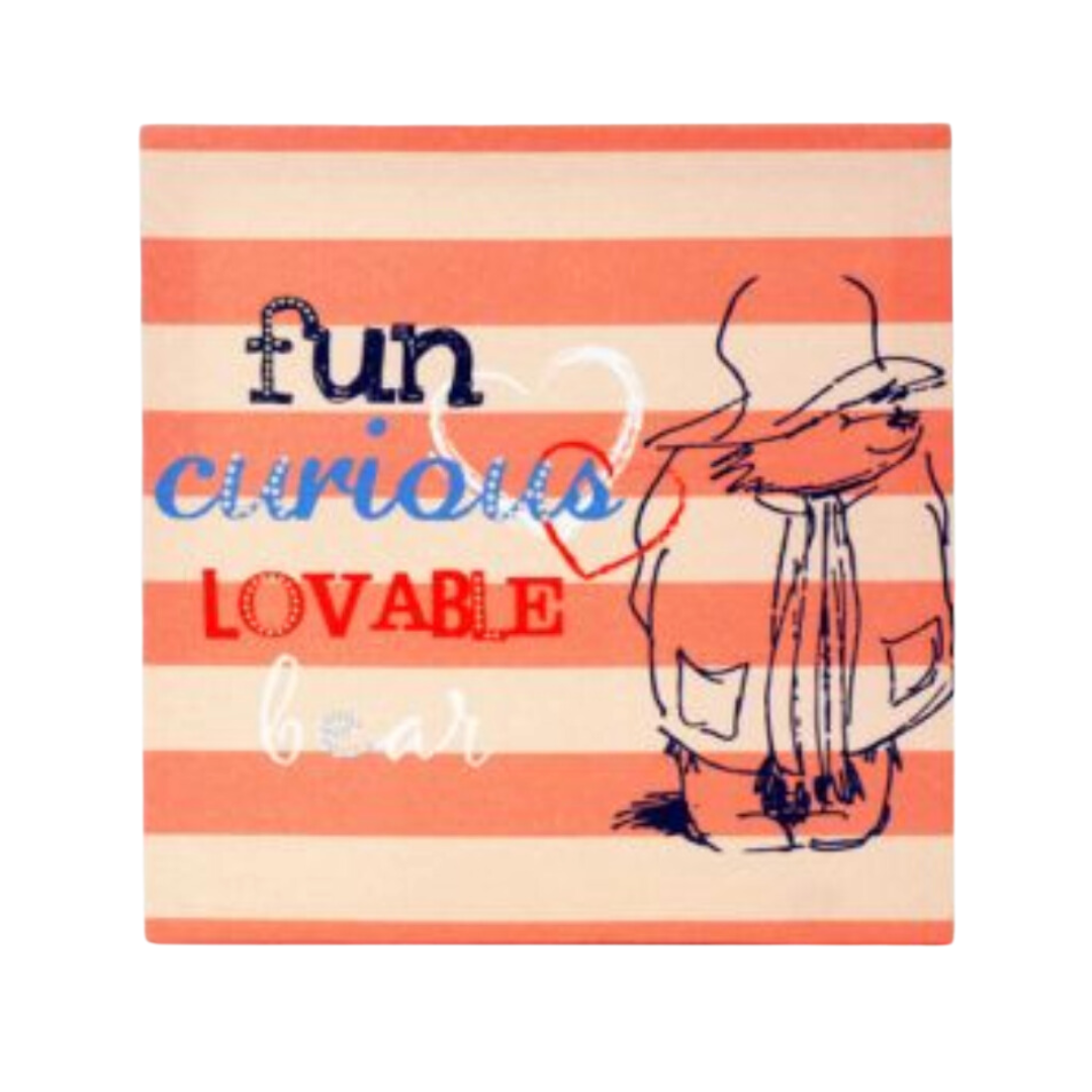 Bring a burst of fun and joy to your home with this exclusive Paddington Bear canvas! Peggy Fortnum's delightful illustration of Paddington is set on a pastel pink striped background, perfect for adding colour to any room. Official Paddington Bear Merchandise, this canvas comes cello-wrapped and ready to hang. Delightful and unique, it's the perfect gift!